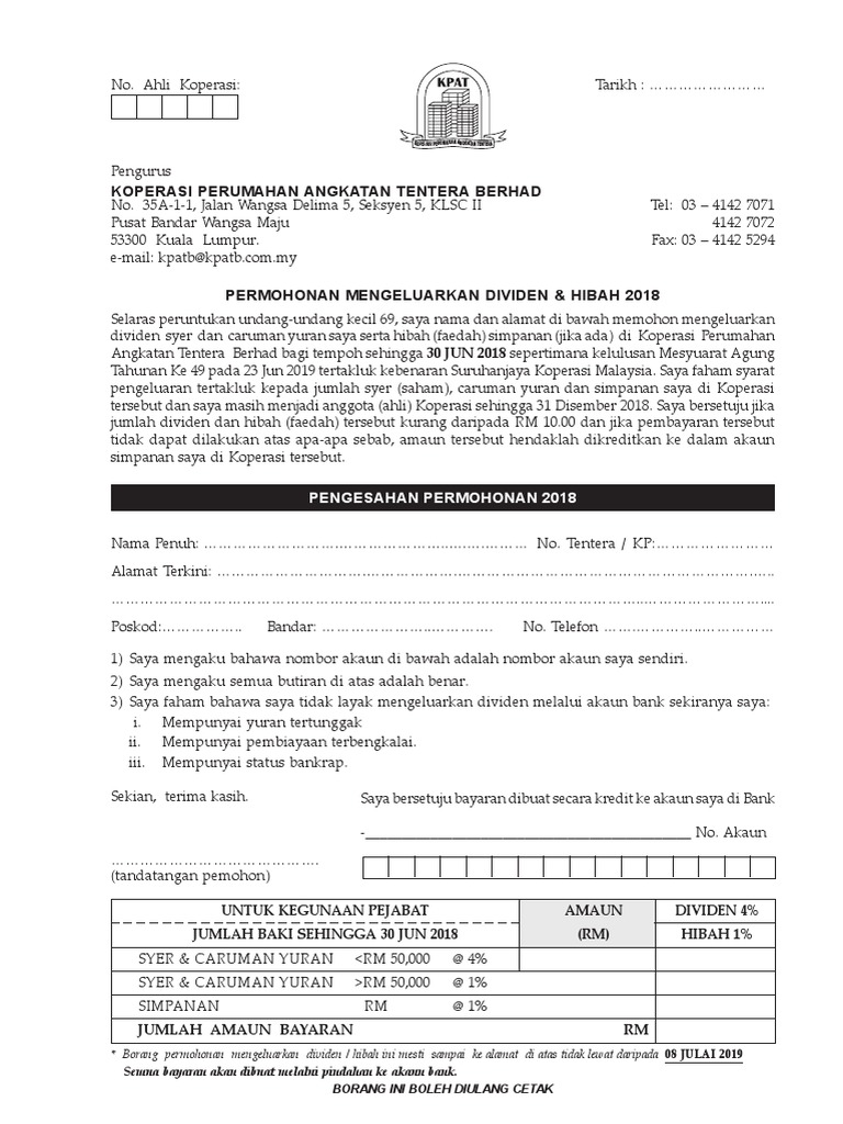 KOPERASI PERUMAHAN ANGKATAN TENTERA BERHAD KPATB KOPERASI PERUMAHAN ANGKATAN TENTERA BERHAD No 35A-1-1 Jalan Wangsa Delima 5 Seksyen 5 Pusat Bandar. KOPERASI PERUMAHAN ANGKATAN TENTERA BERHAD No 35A-1-1 Jalan Wangsa Delima 5 Seksyen 5 Pusat Bandar Wangsa Maju KLSC II 53300 Kuala Lumpur. Makluman waktu operasi koperasi perumahan angkatan tentera berhad kpat semasa perintah kawalan pergerakan pkp adalah seperti notis di.